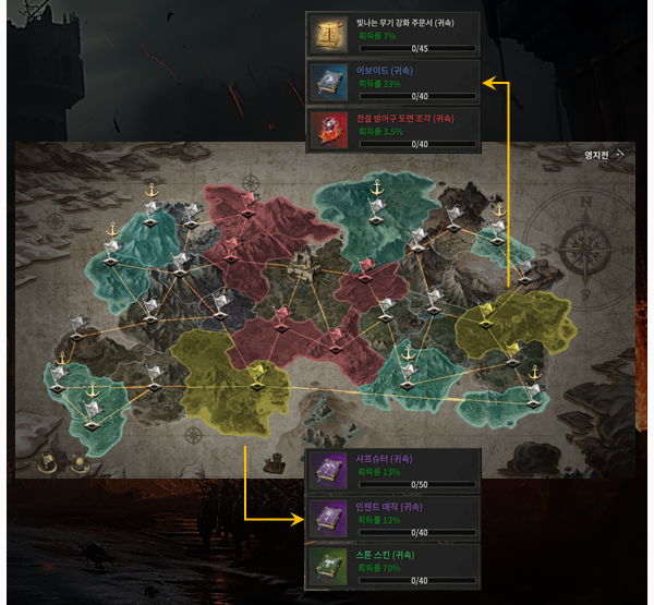 영지는 총 27개로, 한 번에 모든 영지를 오픈하지 않는다. 8개의 영지만 먼저 오픈되며, 오픈된 영지는 초록색으로 표기될 예정이다. 먼저 오픈된 지역을 점령한 후 다음 지역을 점령해 가는 방식으로 진행된다. 향후 칼데스 성을 두고 펼쳐지는 공성전에 참가하려면 특정 영지를 점령해야 하며, 해당 영지는 맵에서 붉게 처리된다.