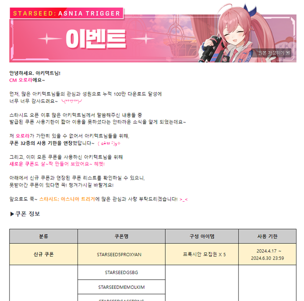 이와 함께 지속적으로 유저들의 건의가 이어졌던 쿠폰 사용 기간 연장에 대한 문의도 곧바로 수용하여 오는 6월 30일까지 사용할 수 있게끔 조치가 이뤄졌다. 더불어 현재 공개된 모든 쿠폰들을 공식 카페에 공지사항으로 정리해 유저들의 편의성을 높였다.