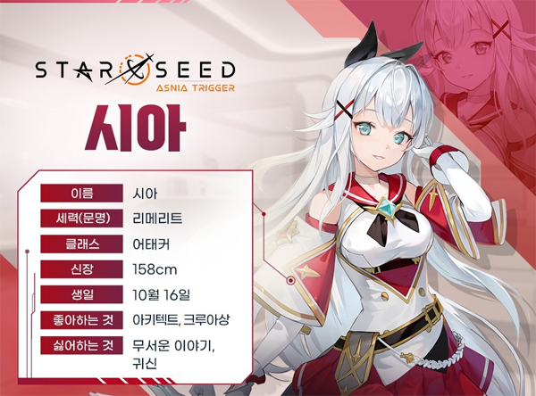 시아는 오델리아 학생회 서기를 맡고 있는 프록시안으로 리메리트 전술대항전 42회 우승자로 소개됐다. 여기에 차분하고 기품 있는 외모와 달리 마이 페이스에 외로움을 잘 다는 성격까지 소개하며, 유저들이 더욱 많은 것을 파고 들 수 있도록 만들었다.