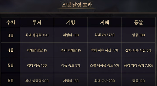 또한, 4가지 스탯은 일정 수치 이상을 달성하면 부가효과를 제공한다. 각 스탯이 특정 수치에 도달하면 받는 추가 효과로서, 투지의 경우 30을 달성하면 최대 생명력 750, 40을 달성하면 피해량 경감 15를 제공한다.