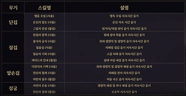 그리고, 추가 피해량은 공격 적중 시 최종 피해 수치에 가산되기에 공격 속도가 빠르고 타격 수가 많은 석궁, 단검에 효율적이다. 이와 반대되는 피해량 경감은 최종적으로 받는 피해가 감소하는 능력이다. 장검은 반격의 방벽 스킬로 상대에게 반사를 할 수 있어 피해량 경감 수치가 높을수록 반사 피해도 커져 방어와 공격 모두에서 효과적이다.