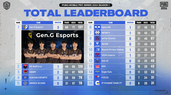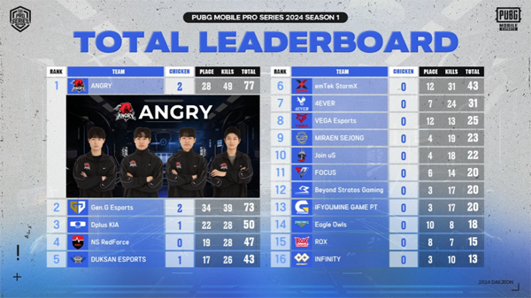 1일차 최종 순위는 이날 마지막 경기인 매치6 미라마 경기 끝까지 알 수 없었다. 최상위권 젠지와 엥그리, 디플러스 기아가 탑4까지 살아남아 주도권을 가져가기 위한 다툼을 이어갔다. 결국 엥그리가 프로팀의 저항을 이겨내면서 18킬 치킨을 확보했다.