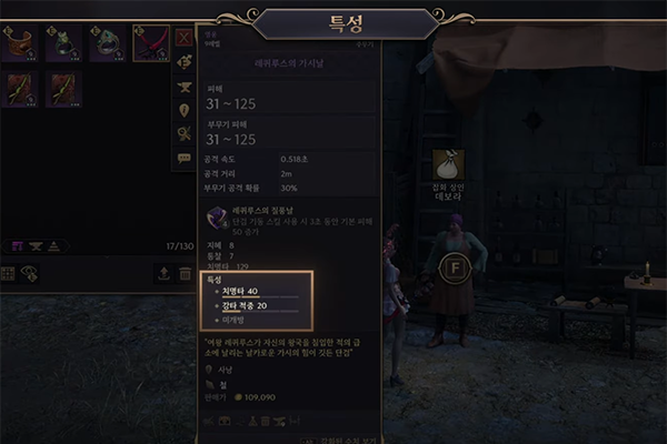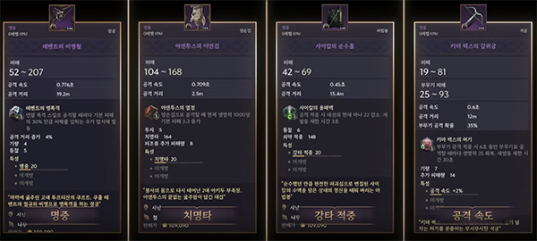장비 중 무기에 붙는 특성은 명중, 치명타, 강타 적중, 공격 속도 등이 있다. 공격 속도는 일반 공격인 평타의 주기를 단축하고, 스킬 시전 시간과 캐스팅 시간이 필요한 스킬 시전 속도를 줄여준다.