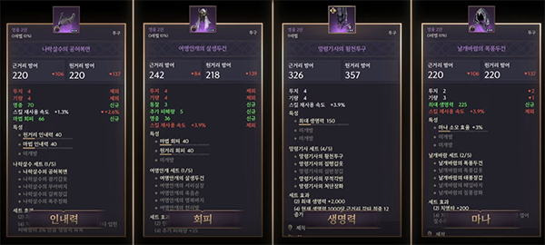 방어구에는 인내력, 회피, 생명력, 마나 등의 특성이 붙는다. 인내력은 수치 10마다 치명타 확률을 약 1% 감소시켜 주고, 회피는 수치 10마다 적의 공격을 피할 확률이 약 1% 증가한다.