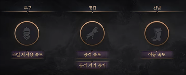 무기와 달리 방어구는 특정 부위에만 등장하는 특성이 존재한다. 예컨대 투구 재사용 속도는 투구만 붙고, 공격 속도 및 공격 거리 증가는 장갑에만 붙는다. 이동 속도 또한 신발에만 적용된다.