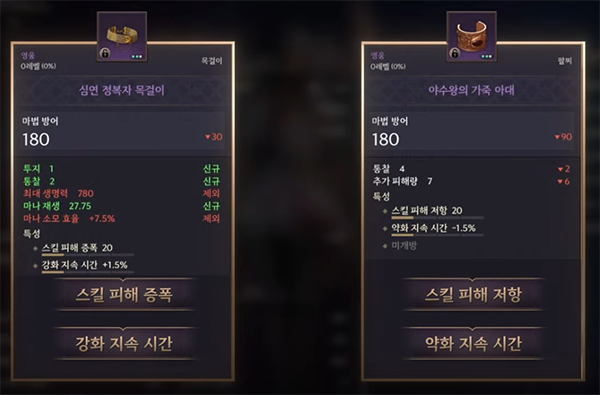 장신구에 붙는 특성으로는 목걸이에서 스킬 피해 증폭, 강화 지속 시간을 챙길 수 있다. 팔찌에는 스킬 피해 저항, 약화 지속 시간의 특성이 붙는다. 스킬 피해 증폭은 스킬 공격력을 비롯해 회복 스킬의 회복량을 증가시켜 준다. 스킬 피해 저항은 적대 유저의 공격 스킬이나 보스 및 일반 몬스터의 스킬 피해량을 줄여주는 효과가 있다.