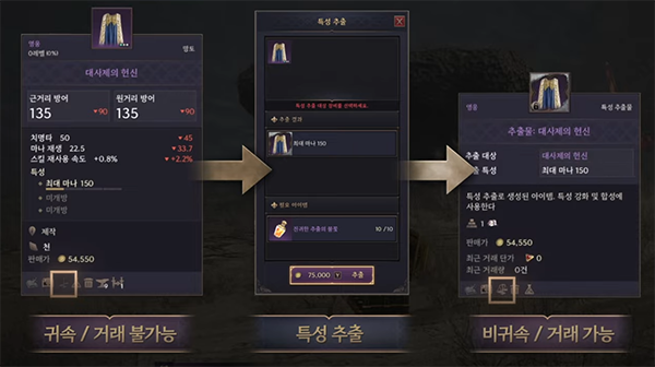 장비 추출은 자주 사용하는 기능이다. 귀속 아이템 추출 시 비귀속 아이템으로 전환할 수 있기 때문이다. 던전에서 획득한 아이템은 귀속이라 거래소에 판매할 수 없지만, 장비 추출을 거치면 비귀속으로 전환되어 거래소 이용이 가능하다. 대신 강화된 장비나 특성 강화를 거친 장비는 추출이 불가능하다.