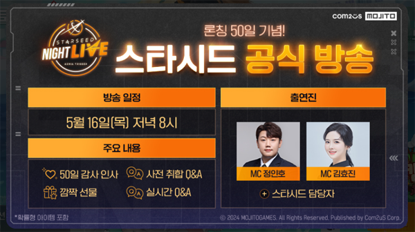 오는 5월 16일 예정인 50일 기념 방송에서는 두 명의 MC와 스타시드 담당자를 중심으로 게임과 관련된 내용들이 소개될 예정이다.