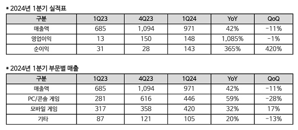 네오위즈의 1분기 매출은 971억 원, 영업이익은 148억 원을 기록했다. 전년 동기 대비 각각 42%, 1,085% 증가한 수치다. 당기순이익은 143억 원으로 전년 동기 대비 365% 증가했다.