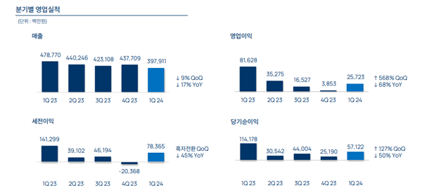 매출액은 전년 동기 대비 17% 감소했으며, 전분기 대비 9% 감소한 수치다. 영업이익은 전분기 대비 568% 증가한 수치지만 전년 동기 대비 68% 감소했다. 당기순이익은 전년 동기대비 50% 감소 했으며, 전분기 대비 127% 증가했다.