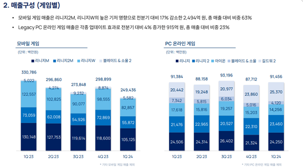 엔씨소프트 2024년 1분기 주요 매출은 모바일 게임이 이끌었다. 리니지M, 리지니2M, 리니지W 등이 2,494억 원의 매출을 올려 총 매출 대비 비중 63%를 차지했다. 온라인 게임에서는 전분기 대비 업데이트 효과로 4% 상승한 915억 원을 달성했다.