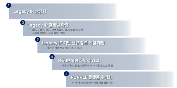 또한 '블레이드앤소울2'의 중국 진출, '리니지2M' 동남아 출시, '쓰론앤리버티(TL)' 글로벌 출시 등 글로벌 서비스 지역 확장도 지속 추진한다. 이와 함께 자체 플랫폼인 퍼블의 수익화 구상을 넘어 실질적으로 AAA급 게임을 퍼블리싱해 출시 하는 것을 목표로 하고 있다.