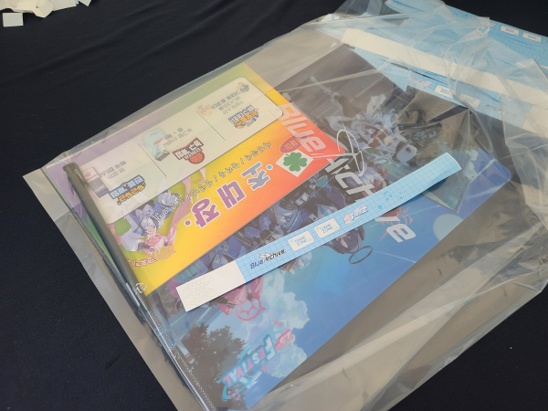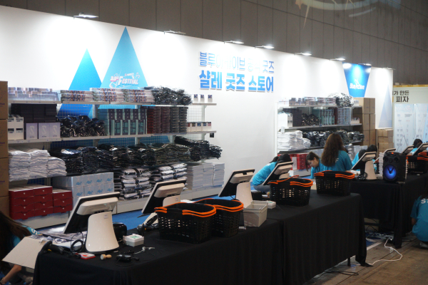 관람객들의 1차 방문 목표라고 할 수 있는 '블루 아카이브' 공식 굿즈샵이다. 메인으로 내세우는 것은 점퍼와 티셔츠, 완장, 머플러 등이었다.