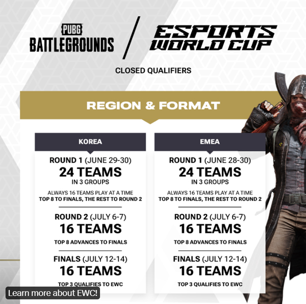 한국 지역의 '배틀그라운드' EWC 진출전은 오는 6월 29일부터 시작된다. 총 24개 팀이 대결을 펼칠 예정으로, 8개 팀 씩 3개 조로 나뉘어 교차 대결을 통해 8팀은 예선 파이널로 직행한다. 나머지 16개 팀은 2라운드 경기를 진행해 다시 8개 팀을 가린다.