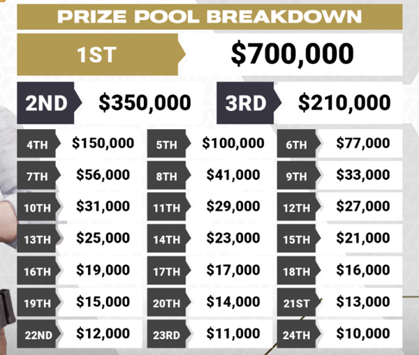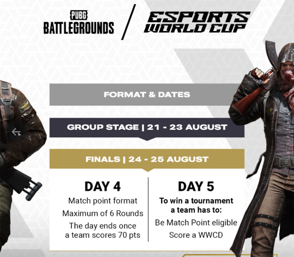 사우디에서 열리는 EWC '배틀그라운드' 본선 경기는 8월 21일부터 25일까지 5일간 진행된다. 총 상금은 200만 달러(한화 약 27억 5천만 원)다. 우승 팀에게는 70만 달러(한화 약 9억 5천만 원)가 지급되며 최하위 팀인 24등에게도 1만 달러(한화 약 1300만 원)가 지급된다.