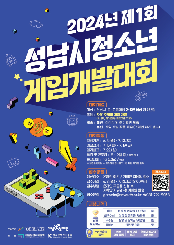 재단법인 게임인재단(공동이사장 남궁훈, 이나정)과 성남시청소년재단(대표이사 최원기)이 공동 주최·주관하는 ‘2024년 제1회 성남시청소년게임개발대회’가 6월 3일(월) 온라인 접수를 시작했다.
