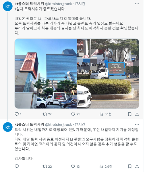 이에 KT롤스터 팬들은 6월 4일부터 KT 본사의 광화문 일대와 라이엇게임즈 코리아가 위치한 삼성동 일대, 수원과 분당에 위치한 KT스포츠단을 향한 시위 트럭을 예고했다. 모금과 문구 선정을 마친 후 1.5톤 트럭 3대를 동원했다.