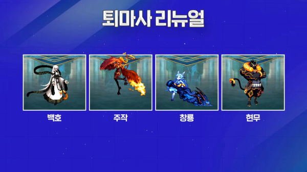 퇴마사 리뉴얼도 언급됐다. 물리-마법-퇴마사로 나눠진 콘셉트를 통합하고, 4신수의 콘셉트를 활용한 스킬에서 각 신수의 모습이 더 돋보이게 바뀐다. 그리고 식신의 군 스킬을 삭제하고, 1차 각성 스킬을 리뉴얼한다. 그리고 남 크루세이더의 스킬 개편과 여 격투가에 대한 다양한 리뉴얼이 진행된다.