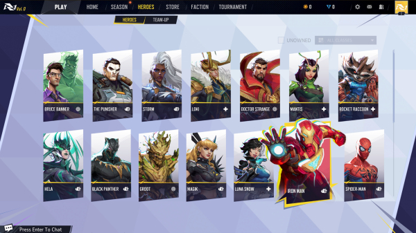 넷이즈게임즈가 공개한 체험 버전에는 총 19명의 캐릭터가 등장했다. 화면을 보면 헐크(브루스 배너), 퍼니셔, 스톰, 로키, 닥터 스트레인지, 맨티스, 로켓, 헬라, 블랙팬서, 그루트, 매직, 루나 스노우, 아이언맨, 스파이더맨 등의 캐릭터가 확인된다.