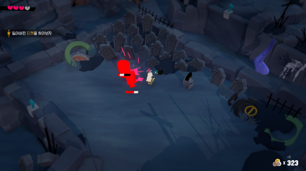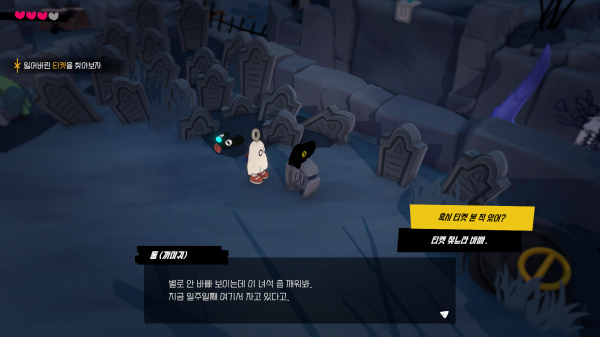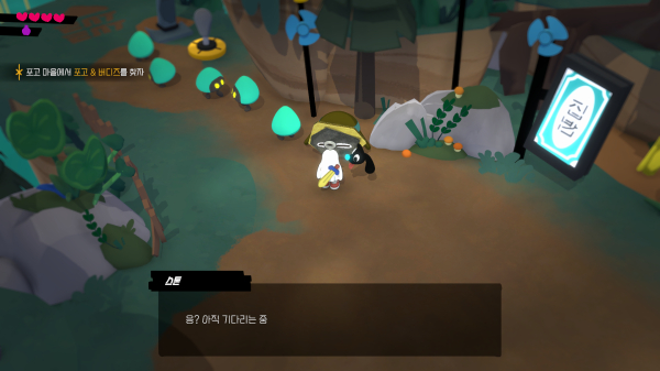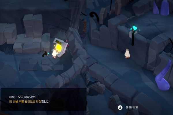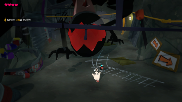 처음에는 기본 튜토리얼을 겸하는 이동과 조작을 하게 되고, 이윽고 흑설탕단 로우와 만나면서 본격적인 모험의 막이 오른다. 유저 인터페이스는 깔끔 그 자체다. 왼쪽 위의 체력 게이지와 목표 텍스트만 있고, 별다른 것이 존재하지 않는다. 조작 버튼도 장르 대비 적은 편에 속할 정도로 간단하다.