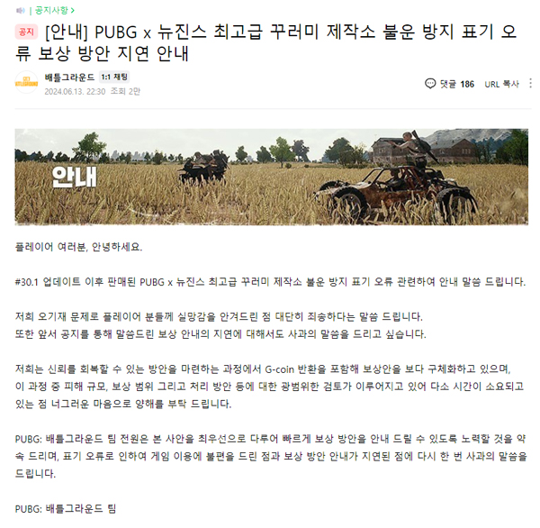 오표기에 따른 유저 보상 방안에 대해서도 크래프톤은 언급했다. 만 하루 동안 관련된 보상안의 공지가 늦어지자 유저들의 항의가 지속됐고, 크래프톤은 지난 13일 늦은 밤, 추가 공지를 통해 현 상황들을 적극적으로 공유했다.