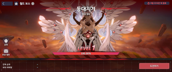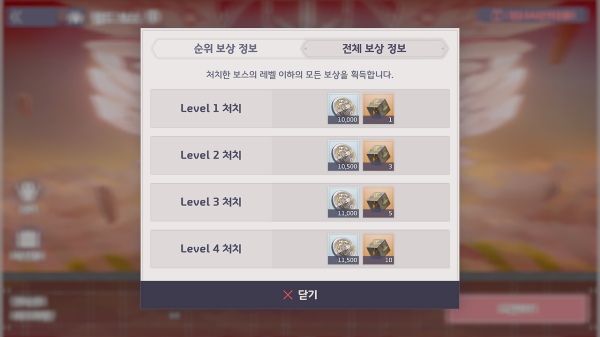 기존의 기록을 경신하면 새로운 피해량이 보스의 HP에 반영된다. 보스의 레벨은 1~5레벨이 존재하며, 처치 시 다음 레벨의 보스가 등장한다. 보스의 레벨에 따른 난이도 차이는 없으며, 보스의 HP와 보상만 증가한다.