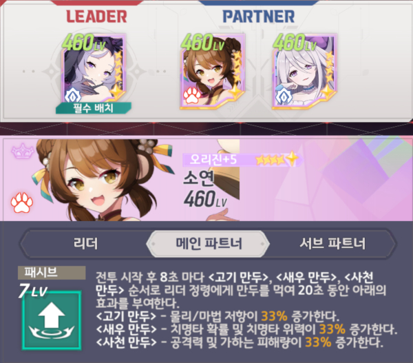 초기에는 파트너 정령의 메인 스킬이 같이 발동되는 형태로 구상했지만, 이렇게 설계할 경우 일부 정령의 경우 활용도가 낮아지는 문제가 있어서 파트너 스킬을 새로 추가하게 됐다고 한다. 서브 파트너로 배치된 정령의 역할에 따라 리더 정령에게 능력치 증가 효과가 적용되며, 서브 파트너 정령의 등급에 따라 증가하는 능력치의 수치가 증가한다.