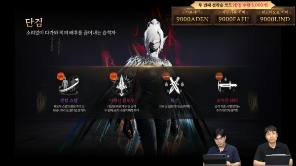 다음은 클래스 케어다. 단검과 오브 클래스에 대해 동시에 진행된다. 먼저 단검 클래스는 신규 스킬로 팬텀 스텝, 어쌔신 블로우가 추가된다. 팬텀 스탭은 쉐도우 스텝을 강화해 대미지가 광역으로 진행되고 콤보 추가 및 사용 시 하이드 쿨타임이 초기화된다.