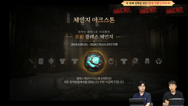 이번 업데이트를 통해 프리 클래스 체인지를 할 수 있는 ‘체인지 아크스톤’이 등장한다. 모든 유저를 대상으로 완전 무료로 지급되며, 6월 26일부터 7월 10일까지 2주간 진행된다. 이를 통해 새로운 클래스로 플레이를 해볼 기회를 얻게 된다. 만약 이전 클래스로 복귀하고 싶다면, 7월 10일 이후에 다시 복귀할 수 있는 리턴 클래스 체인지 기회가 무료로 주어질 예정이다.