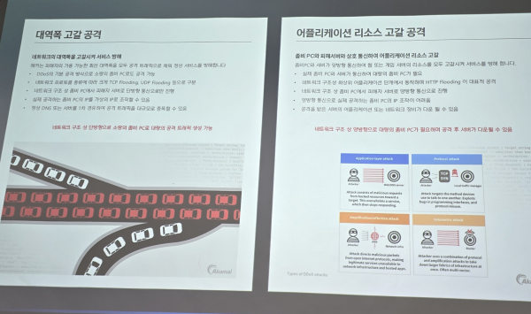 그리고 어플리케이션 리소스 고갈 공격은 서버 세션이나 유저 입장 한계치를 넘겨 시도하는 것이다. 특정 사이트에 많은 사람이 접속하게 하는 것을 말하는데, 시스템 입장에서 접속이 동시에 몰리는 것과 디도스 공격을 구분하기 힘들다고 한다. 그래서 막기가 아주 힘들고, 공격자가 우위를 점하고 있는 구조다. 해커들은 이 두 가지 방식을 혼합해서 사용한다고 한다. 그것이 효과적이기 때문이라는 것.
