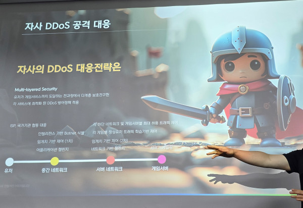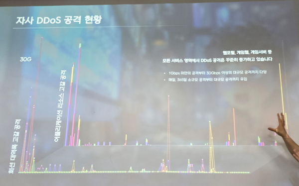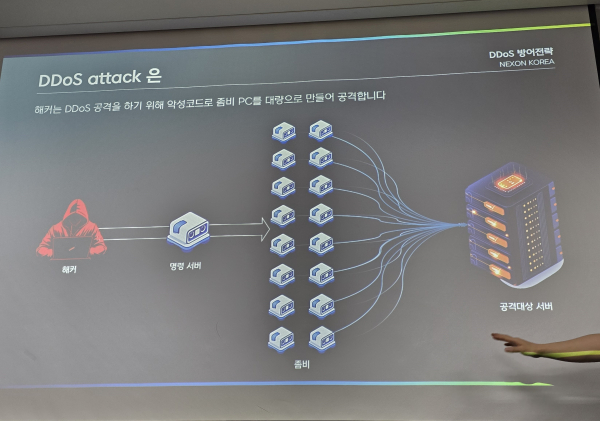 넥슨을 대상으로 한 해커들의 디도스 공격은 매일 발생하고, 게임별로 이뤄진다고 한다. 그 규모도 1Gbps 미만부터 30Gbps 이상까지 다양하다. 이를 위해 넥슨에서는 유저가 게임에 접속할 때까지 각 구간의 전략을 다르게 하고 있다고 한다. 유저가 ISP를 거쳐 올 때 중간 네트워크 구간과 서버 네트워크 구간, 게임서버 등 총 3개의 구간을 거치게 된다.