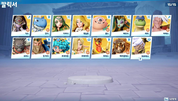 얼리엑세스 단계의 캐릭터(칼릭서) 종류는 총 15종이 공개됐다. 캐릭터는 그리스 로마 신화 속 영웅과 신들이 '배틀크러쉬'만의 장점으로 꾸며졌으며, 다양한 스킬 구성과 특징을 갖추고 게임 속에 등장했다. 기본 캐릭터는 디아나를 제외하고는 모두 구매를 통해 확보할 수 있으며, 유료 혹은 무료 재화를 통해 확보 가능하다.