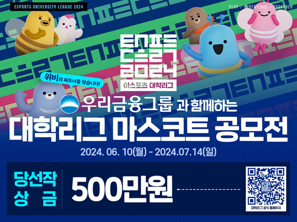 한편, 이번 파트너십을 계기로 이스포츠 대학리그는 ‘우리금융그룹과 함께하는 마스코트 공모전’을 진행중이다. 대학리그의 주인공인 대학생이 직접 마스코트를 만들어 함께 만드는 리그의 취지를 담았다. 공모전에는 대학교 재(휴)학생 누구나 참여할 수 있고 개인 혹은 3인 이내로 팀을 꾸려, 오는 7월 14일(일)까지 참여할 수 있다. 당선작에는 상금 500만원이 수여되며, 심사결과는 7월 17일(수)에 발표될 예정이다.