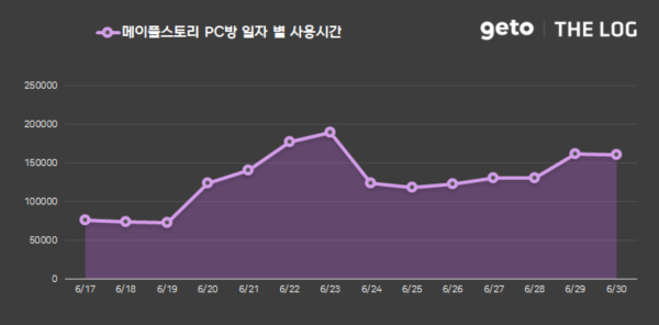 실제로 6월 말 ‘메이플스토리’의 PC방 이용시간 추이를 보면, 업데이트 날짜인 6월 20일 전까지 일일사용시간은 약 7만 시간이었다. 하지만 20일부터 10만 시간을 넘어섰고, 주말에는 20만 시간 가까이 늘었다. 그 이후에도 평일에 10만 시간을 거뜬히 넘기며 PC방 점유율이 상승했고, 주간 순위에서도 5위까지 올랐다.