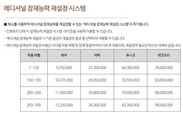 또, 이번에 새로 도입된 에디셔널 잠재능력 재설정 시스템에 ‘레어’와 ‘에픽’ 등 저등급 구간의 재설정 비용을 완화, 적절한 수준의 능력치를 보다 쉽게 획득할 수 있는 환경을 마련했다.