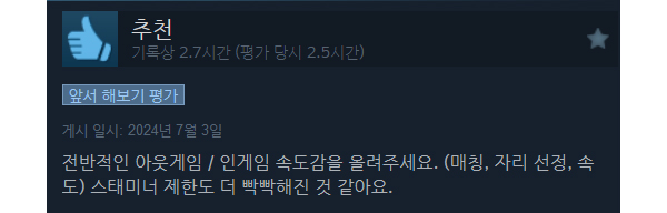 하지만, 현재 스팀 평가는 복합적으로 다소 애매한 상황이다. 절반이 못 미치는 45%의 유저만이 긍정적인 평가를 내렸다. 모바일 버전 또한 인기 순위에서 중위권에 자리 잡고 있어 초반 흐름이 중요한 신작으로서 반등이 절실하다.