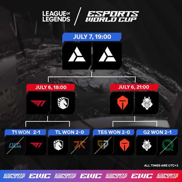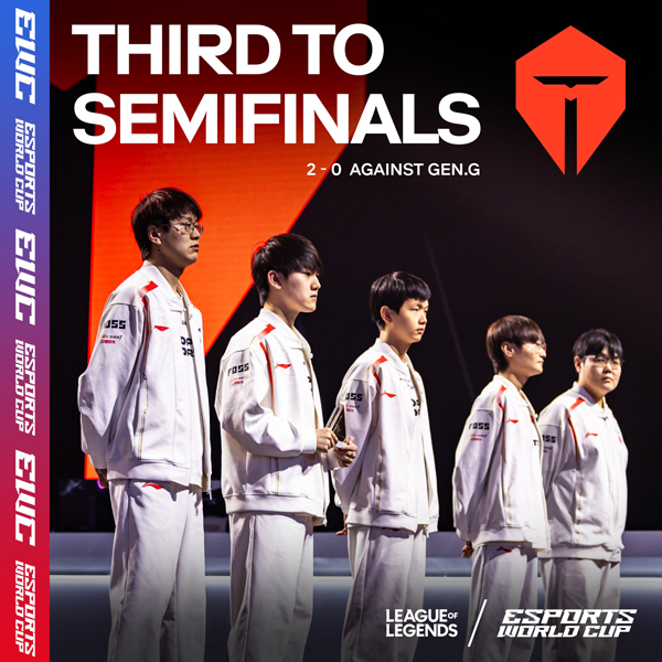 한편, 이날 경기들로 'e스포츠 월드컵 리그오브레전드' 종목의 4강 대진이 완성됐다. LCK에서는 T1만이 살아남은 가운데, 북미의 TL을 상대로 4강전에 나선다. 젠지를 꺾은 TES는 유럽의 강호 G2와 결승 티켓을 놓고 맞대결을 펼친다.