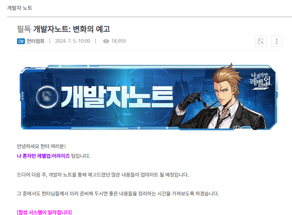 지난 7월 5일, 넷마블은 '나 혼자만 레벨업' 관련 커뮤니티의 개발자 노트를 통해서 10일 도입될 업데이트 콘텐츠를 먼저 공개했다. 밸런스 수정과 개선 사항 외에도 꾸준히 유저 피드백이 이어졌던 부분들의 변경과 업그레이드가 진행될 것임을 예고했다.