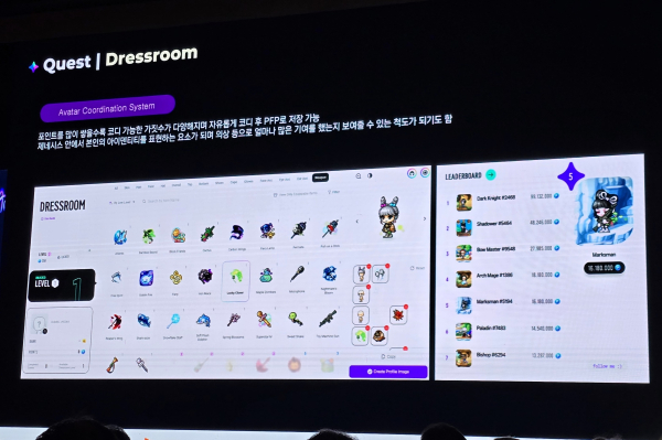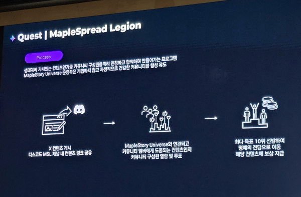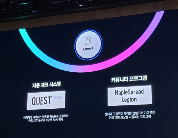 현재는 이를 측정해 나가는 단계이며, 퀘스트는 웹3 플랫폼인 ‘갤럭시’와 연동된 자동 체크 시스템과 디스코드에서 커뮤니티 프로그램인 ‘메이플스프레드 리전’ 등 두 종류로 진행되고 있다.
