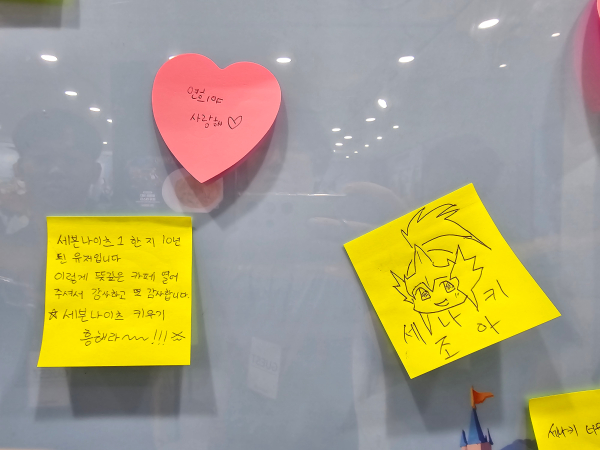 콜라보 카페의 필수라고 할 수 있는 메모 공간이다. 게임 자체는 물론 캐릭터에 대한 응원의 메시지가 있기도 했고, 캐릭터를 직접 그린 메모지도 볼 수 있었다.