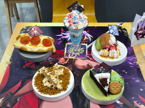 디저트의 실제 모습이다. 시계방향으로 위에서부터 눈보라의 대지 파르페, 달빛의 섬 벚꽃 보름달 케이크, 용제의 갸또 쇼콜라 케이크와 녹차 아이스크림, 침묵의 광산 크런치 치즈케이크, 불새로 구운 피자맛 핫도그다.