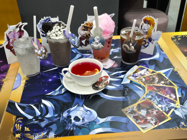 음료의 실제 모습이다. 좌로부터 레드와 함께 만든 용과 에이드, 빛의 자리 쿠앤크 스무디, 오행산 복숭아 스파클링, 침묵의 사신 아이스 아메리카노, 붉은 대지의 무신 오미자차다. 그 옆에는 메뉴 주문 시 랜덤하게 받을 수 있는 캐릭터 카드가 있다.