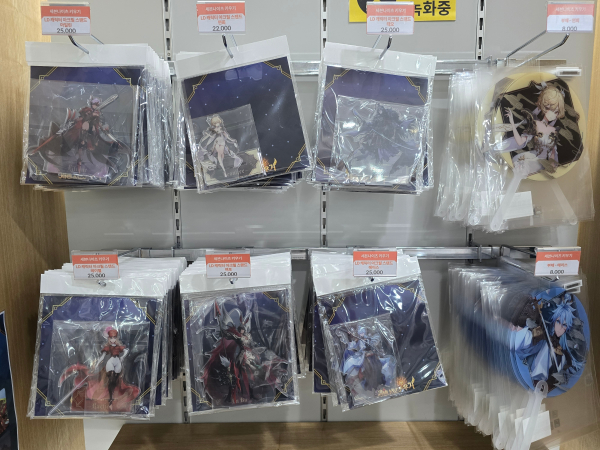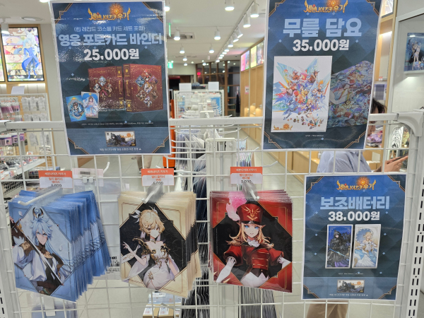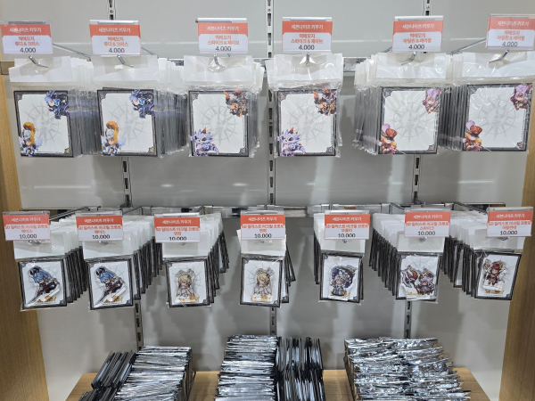메뉴를 먹고 밖으로 나오면 '세나키'의 다양한 굿즈를 만날 수 있다. LD 일러스트 멀티클리너, 트레이딩 캔뱃지, LD일러스트 아크릴 스탠드, SD 일러스트 아크릴 코롯토, 보조배터리, 장패드, 사황 아크릴 시계, 영웅 포토카드 바인더, 에코백, 캐릭터SD 떡메모지, 무릎 담요, SD 일러스트 트레이딩 영웅 띠부씰, 머그컵, 부채, 트레이딩 영웅 포토카드 등 15종의 굿즈가 판매 중이다.