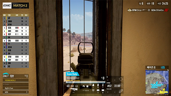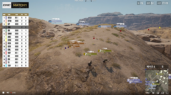 1일차 마지막 경기 매치 6은 에란겔에서 진행됐다. 많은 팀들이 유리한 위치를 선점하기 위해 초반부터 돌산을 차지하기 위한 소규모 교전을 펼쳤다.