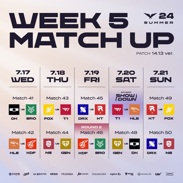 2024 LCK 서머 5주 차는 온라인 플랫폼을 통해 생중계된다. 경기는 평일 오후 5시, 주말에는 오후 3시부터 시작한다.