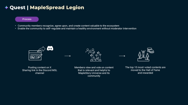 퀘스트는 '메이플스토리 유니버스'가 지향하는 방향성을 유저와 공유하기 위함이다. 커뮤니티 확장에 기여하는 활동을 하거나 창작물을 커뮤니티에 기여한 유저들에게 보상을 제공하고 있다.
