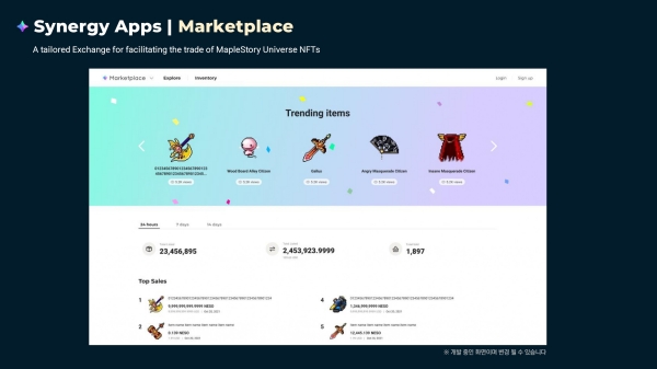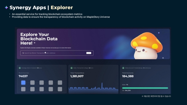 손연수 : '메이플스토리 유니버스: 더 제네시스'에서도 선보인 퀘스트가 그중 하나이며, 앞으로도 다양한 형태로 등장할 예정이다. 또한 NFT의 상세 정보 등을 공식 사이트에서 확인할 수 있는 '내비게이터', 게임 내 아이템을 거래할 수 있는 '마켓플레이스', 그리고 블록체인에 관심이 있는 분들을 위한 '익스플로러' 등을 '메이플스토리 유니버스'의 핵심 콘텐츠로서 순차적으로 개발할 예정이다.