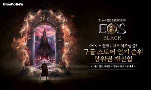 블루포션게임즈(대표 정재목, 조승진)는 자사의 최신 모바일 MMORPG <에오스 블랙>이 차트 역주행을 기록하면서 구글 플레이 스토어 인기 순위 8위 진입에 성공했다고 29일 밝혔다.