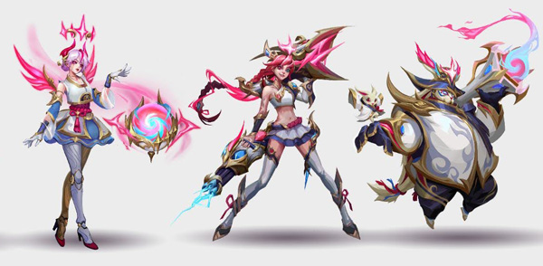 아트 디렉션 설명 이후에는 콘셉트 방향성에 대한 설명이 이어졌다. 각 선수 스킨에는 우승을 상징하는 선홍색 별이 배치되어 있으며, 페이커의 오리아나 스킨에는 왕관에 4개의 별을 배치했다. 또한 롤드컵 MVP를 받은 제우스는 프레스티지 스킨 버전을 통해 차별점을 가져가기 위한 노력을 보여줬다.