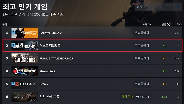 유저들은 이 업데이트에 환호했고, 이는 고스란히 매출로 연결된 것으로 나타났다. 한국 시간으로 늦은 밤에 업데이트가 진행됐는데, 다음 날인 1일 현재 스팀 플랫폼에서의 매출 순위는 ‘카운터 스트라이크2’의 뒤를 이어 2위에 오른 것으로 나타났다. 그만큼 ‘퍼스트 디센던트’의 행보가 성공적이라는 평가다.